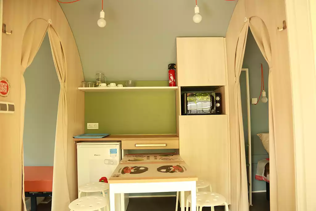 - Coin cuisine avec table pliante et tabouret, frigo top, micro ondes cafetière, placard, vaisselle